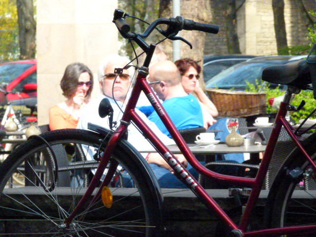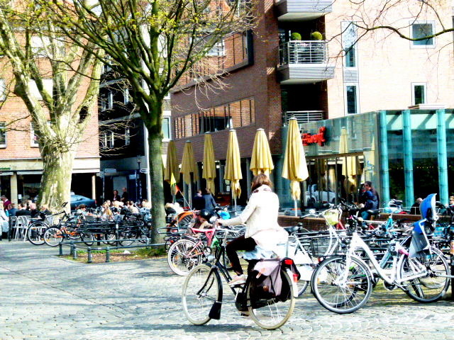 In der Stadt sind überall Parkpätze für Fahrräder ausgewiesern. Gastronomie mit Sitzplätzen im Freien gibt es an jeder Ecke.