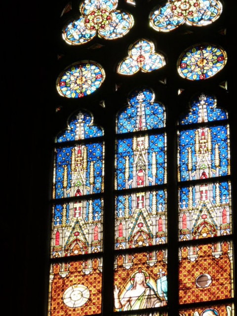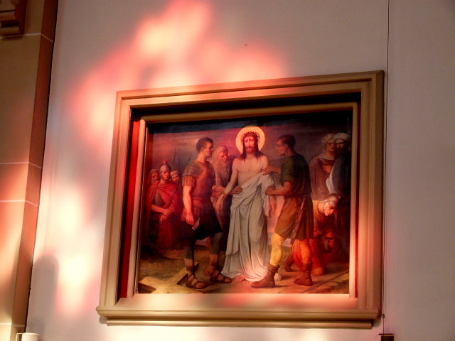 Glasfenster werfen ein besonderes Licht auf die Bilder des Kreuzweges.