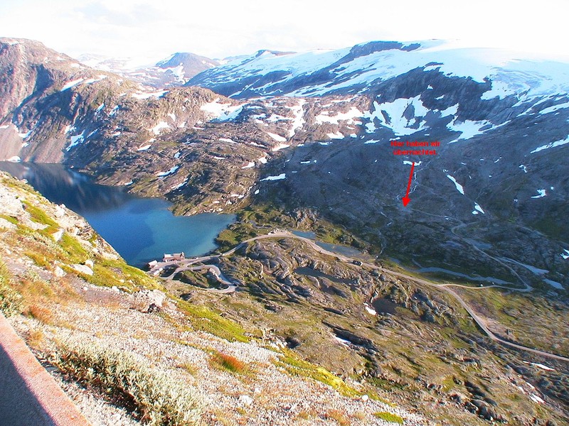 DAS kann ich nur bestätigen. Dalsnibba würde ich niemals nicht auslassen. Adlerstrasse und Trollstigen auch nicht. Anfang Juni ist der Trollstigen sowie der Weg zum Dalsnibba auch eigentlich schon längst frei gefräst und befahrbar. Wenn etwas Bewegung angesagt ist, so kann man, wie wir es taten, das Womo unten stehen lassen und zu Fuß hinaufgehen. ![]() Ein wunderbarer Blick hinunter auf den Geirangerfjord ist die Belohnung. ![]() Wir haben dann unten abseits der Straße übernachtet. ![]() Es war ein herrlicher Tag und ein Ausflug hinauf ist zu empfehlen.