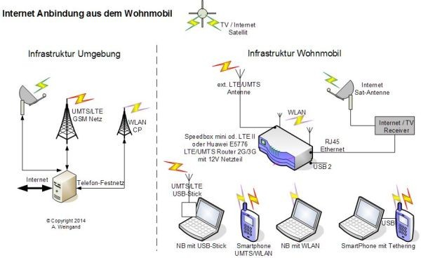 Aus meiner Sicht bleibt nur Satellit, in Europa hat man nicht überall eine verlässliche Verbindung über UMTS, wir waren i Herbst z.B. In Südtirol, da hetzen wir, trotz guter externe UMTS Antenne recht oft keinen Empfang, und zum zweiteilst der gewünschte Upload noch schwerer zu realisieren... Internet über Sat ist da deutlich flexibler und zuverlässiger... Bei den Anforderungen sehe ich nur SAT als Lösung... Satellit ist verlockend aber teuer. Die UMTS-Abdeckung im EU Raum ist doch gut, wenn man nicht gerade im letzten Bergtal sein will. Und Land für Land gibt es einigermaßen günstige SIM Karten. Und es gibt Antennen (so ähnlich wie St-Schüsseln), die die Strahlen bündeln und auf den dahinein gesteckten Stick leiten. Google mal "Grid4Stick-Antenne" Das reicht, so meine ich, auch für Digitalnomaden. Warum Du Cyprus heißt, interessiert mich - denn da lebe ich wenn ich nicht in Kontinentaleuropa nomadisiere... Ich denke ganz Europa ist relativ. Das wird sich vermutlich auf einige Länder konzentrieren. Der upstream hört sich irgendwie nach Videokonferenzsystem an :) Ich würde was anderes machen. Einen Umts-Router plus Verstärker ins Auto. Dazu eine brauchbare Antenne. Entweder Rundstrahl als Festmontage oder eine Richtantenne (möglich ist auch ein kleiner Parabolspiegel. Der bringt am meisten Feuer). Dazu Prepaydkarten des jeweiligen Landes in dem du bist. Das ist mit Sicherheit die einfachste und günstigste Lösung. Nachteil - man muss halt jedesmal ne andere Config in den Router laden wenn man wechselt. Das mache ich aber auch. Das dauert nur Minuten. Ausserdem ist die Verbindung nicht immer gleichmässig gut (die Bandbreite ist eh nie garantiert und vom Standort und den anderen Nutzern des POPs abhängig). Ausserdem kann die Sendeleistung je nach land schon nicht mehr im Bereich des erlaubten liegen was aber eh keiner kontrolliert wenn du nicht über Monate und Jahre am gleichen Stadort verweilst. Sat ist auch nicht unbedingt der Königsweg. Dazu recht teuer. Allerdings meine ich das es inzwischen Anlagen/Verträge gibt die auch recht üppigen upstream bieten. Ich muss aber ehrlich zugeben mich damit aus Mangel an Nutzem nie beschäftigt zu haben. Um sich für eine Technologie zu entscheiden benötigt man eine Datenvolumensanalyse. Upstream/Downstream sowie eine Anforderung der Anbindungsorte/Gebiete etc. Wenn der TE nur in Großstädten unterwegs ist geht Satellit nicht, aber LTE hervorragend. Ist er auch auf Korsika oder in der Bretagne geht LTE nicht, aber Satellit. Hat er seine Programme und Daten in der Cloud kommt er mit den Upstream Datenraten per Satellit nicht klar. Freizeit surfen ist eine Sache, geschäftlicher Nutzen eine andere. Andreas