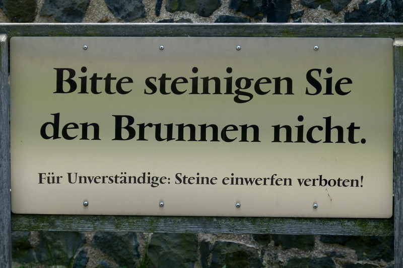 Der Schlossbrunnen hat einen Durchmesser von ca. 3 Metern. Auf den Grund kann man nicht schauen. Daher werfen Besucher gerne Gegenstände in den Brunnen, um zu hören, wann sie aufschlagen. Hier kann man eindeutig lesen, das dieses Verhalten nicht gewünscht ist. :)