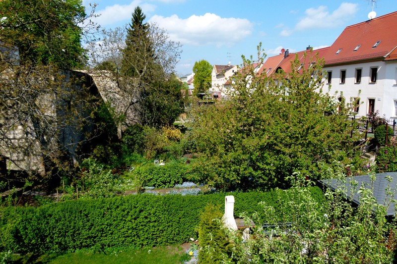 Auf dem Weg zum Schloss kommt man am bewirtschafteten Burgraben vorbei. Viele kleine Schrebergärten ducken sich in den Burggraben.