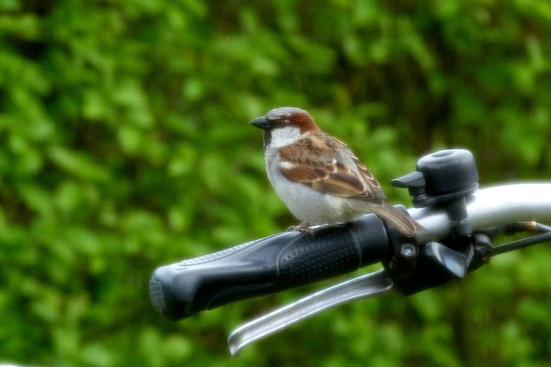 Am Abend erkunde ich die Gegen mit dem Fahrrad und beim Abendessen gesellt sich ein "Anhalter" zu mir und nimmt Platz auf dem Lenker meines Rades. (Durch das Fliegengitter der Tür fotografiert).