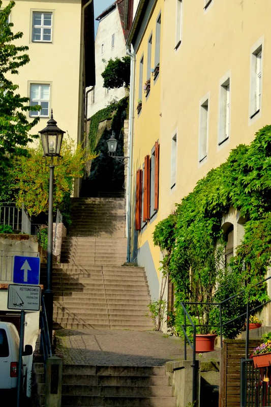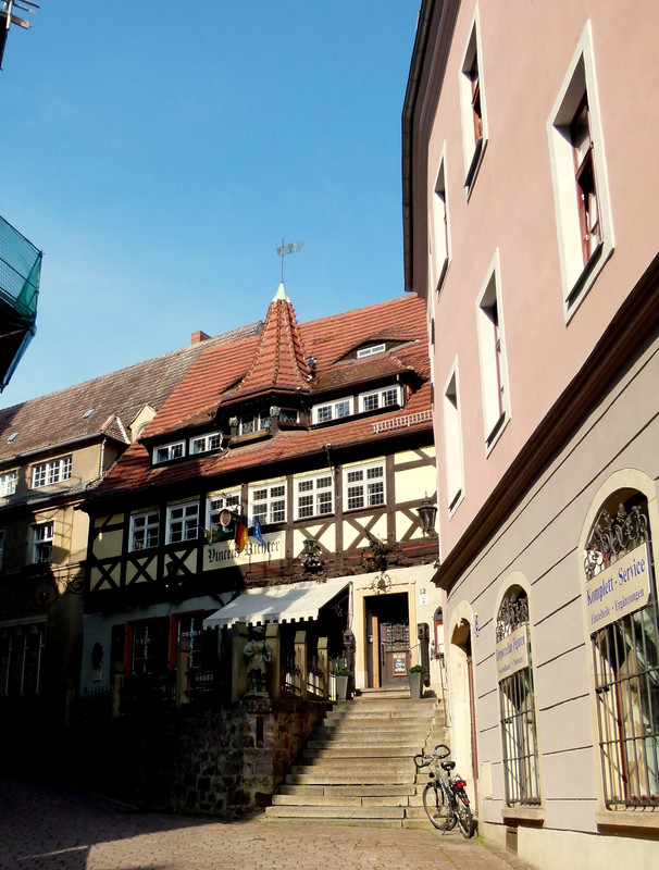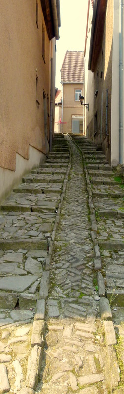 Vom Saaleufer führen enge, stark ansteigende Gassen zum Centrum.