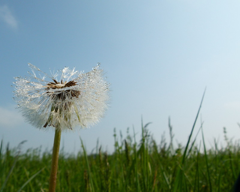 Die Nacht wird sehr kalt und am nächsten Morgen glitzern kleine , gefrorene Tauperlen zwischen den Pusteblumen.