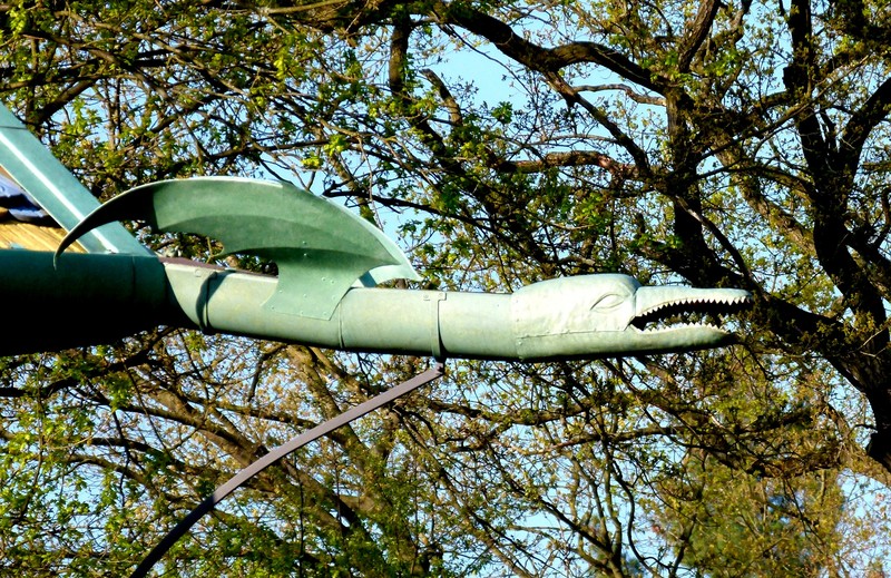 Künstlerisch gestaltete Regenrinnen in Drachenform lassen das Wasser abfließen.