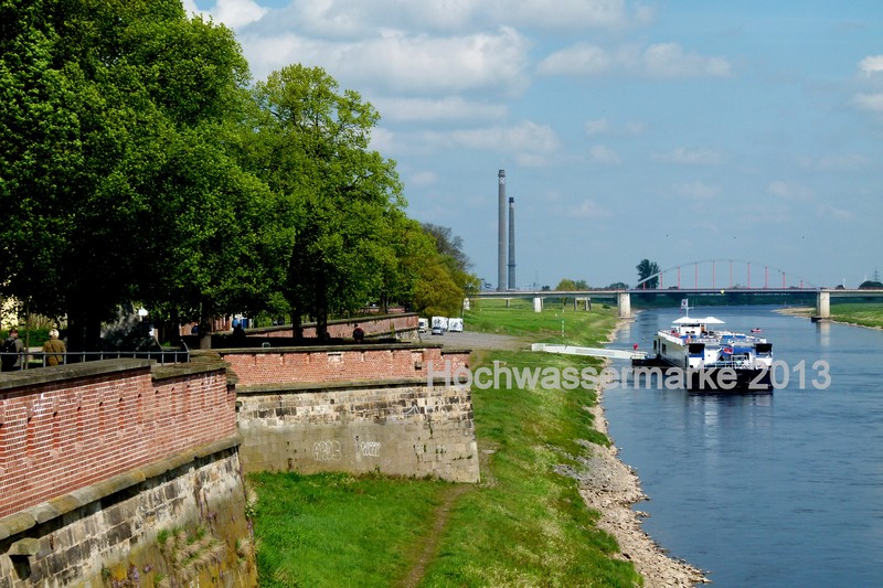 Das Hochwasser der Elbe reichte im letzten Jahr bis an die Kante der roten Backseinmauer. Die Stadt blieb vom Howasser verschont.