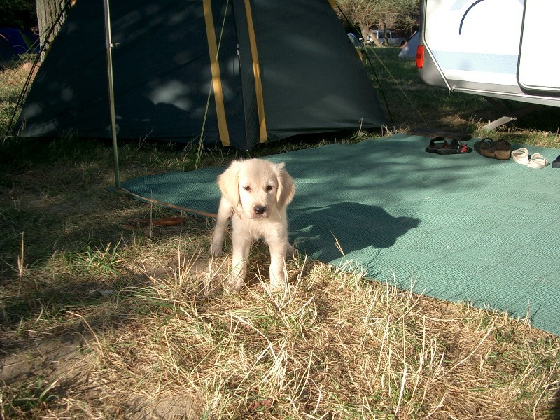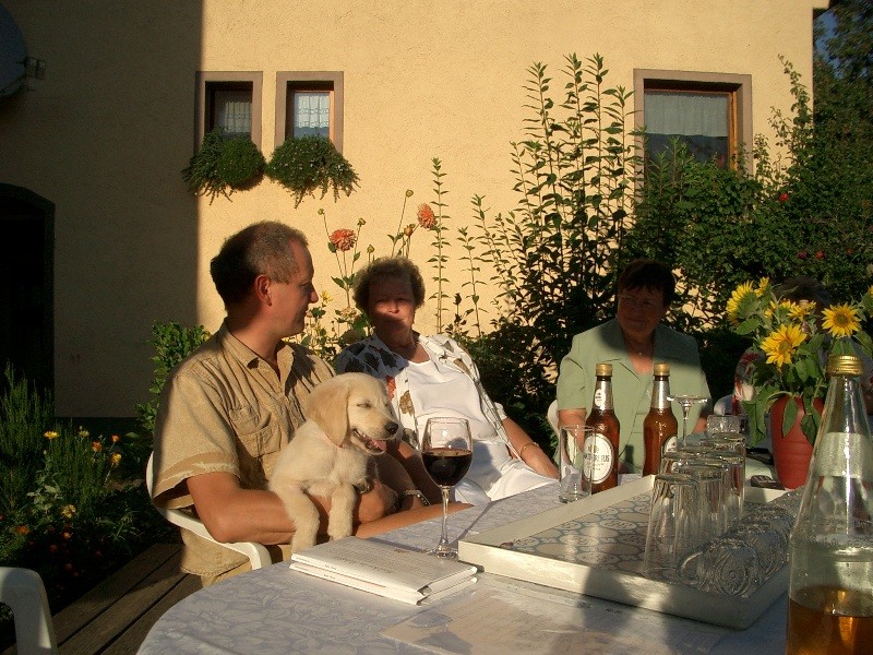 Ich spielte mit meinen Geschwistern und Eltern, bis am 13. August ein rotes Auto vorfuhr und eine Familie mit Kindern ausstieg... wie waren wir neugierig und aufgeregt! Als der Mann mich auf den Arm nahm, machte ich gleich seine Sachen nass. Der Mann lachte und sagte, dass ist nicht schlimm... Dann tauschte er bunte Zettel mit meinem Züchter gegen Papier, eine Leine und ein bisschen Futter ein und setzte mich in das rote Auto.
