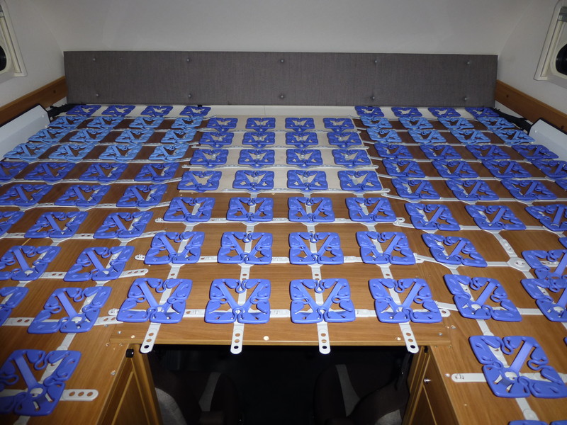 Die Treppe habe ich vollständig entfernt, nur das Schiebebrett unten ist verblieben. So kann ich auch weiterhin die Schiebetüre mit dem Brett dank der Alukante sauber schliessen. Das obere Brett habe ich hinten gegen das Fahrzeugheck genutzt und im vorderen Teil des Alkoven eines aus dem Baumarkt zuschneiden lassen. Du kannst das auf den Bildern erkennen. Darauf sind dann die Froli montiert. So habe ich mit 10cm Höhe plus den Medicole Bezug eine gleich hohe Fläche mit den Mehrzonen Matratzen von Dethleffs erhalten.