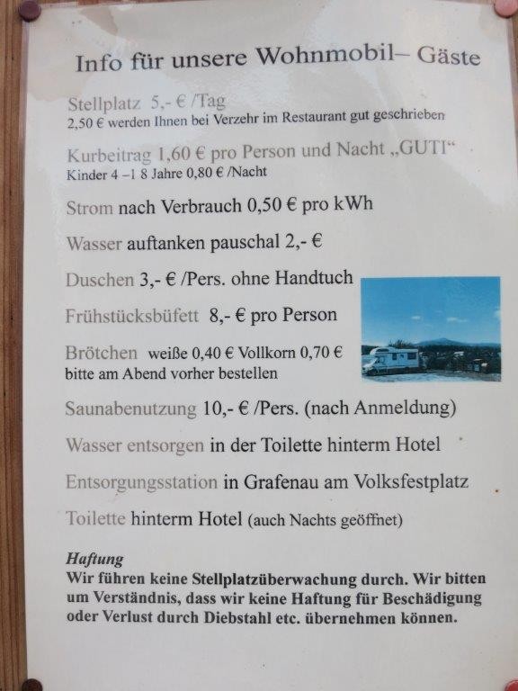 EMPFEHLENSWERT :top: Sehr ruhiger Stellplatz für 3 Wohnmobile an Wiesen und Felder angrenzend. Idealer Ausgangspunkt für das Gebiet um den Lusen und den Rachel. Bei Bezug der Gästekarte können alle Busse und Bahnen im Gebiet kostenlos genutzt werden. Und es gibt diverse Ermäßigungen bzw. freie Eintritte. Wir konnten unseren "ALF" stehenlassen und sind per Pedes bzw. teilweise per Bus losgezogen. Auch Anschluss an das Radwegenetz ist vorhanden. Das Essen im Hotel ist super (wir haben dreimal dort gegessen) und die Wirtsleute bzw. das Personal sind sehr freundlich und hilfsbereit. Strom für die Stellplätze ist vorhanden. Wasser mussten wir nicht tanken; deshalb kann ich die Versorgung nicht beurteilen. Eine Entsorgung über die Toilette (siehe Preisliste anbei) ist nur mit portablem Wasserbehälter machbar. Unsere "Pippibox" haben wir allerdings nicht dort entleert :? Die Toilette ist übrigens von außen zugänglich und daher rund um die Uhr nutzbar. Preisliste, als Aushang direkt bei den Stellplätzen ![]() Stellplatz von der Wiese aus fotografiert; im Hintergrund das Hotel auf der gegenüberliegenden Straßenseite ![]() Die WoMo-Stellplätze sind übrigens als solche gekennzeichnet und mit einer Kette gesperrt, sodass sie nicht von PKWs zugeparkt werden können. LG Barbara |