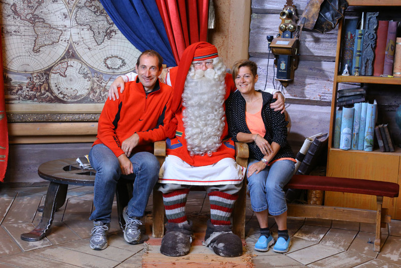Nach ganz kurzer Wartezeit dürfen wir zu ihm. Er begrüsst uns persönlich und spricht sogar etwas deutsch, er kann ja alle Sprachen aller Kinder. Er ist wirklich nett und liebevoll. Natürlich werden vom Fotowichtel auch ein paar Fotos gemacht. Die kann man dann auch kaufen, der Fotowichtel ist auch ein guter Geschäftswichtel, denn die Fotos sind teuer. Zum Santa Claus selber durften wir aber gratis… Wir sparen uns aber die 7 € für den Postkartendienst, wo das Santa Claus Postamt die Karten dann auf Weihnachten versendet wird… Aber das Foto mit dem Schritt über den Polarkreis schiessen wir auch noch, obwohl wir ja gestern schon weit darüber waren.