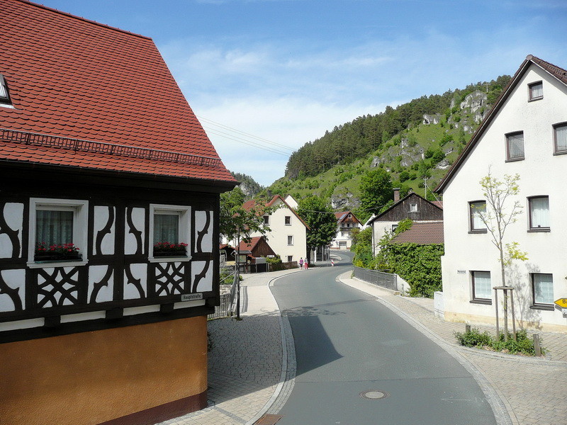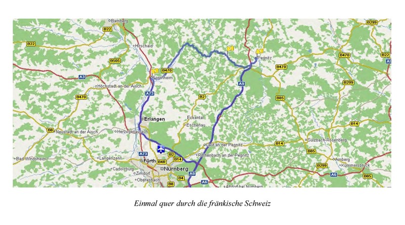Über Ebermannsstadt fahren wir den alten Handelsweg über Gößweinstein nach Pottenstein, immer Richtung Pegnitz. Der Weg ist schon seit Urzeiten befahren worden. Entsprechend viele Burgen, Schlösser und Klöster befinden sich am Wegesrand – früher natürlich mit Schutz-Abgaben behaftet. Die Landschaft ist lieblich, wir fahren in einem Talkessel. Wir fühlen uns an "unser heimisches" Altmühltal erinnert.