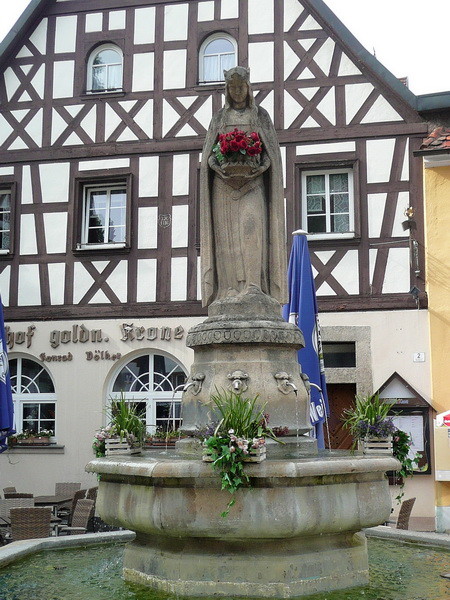 Der untere Brunnen. Die Marienfigur deutet in Richtung Kirche, der Wasserträger soll eine Verbindung zum die Sanierung des Platzes oberen Brunnen herstellen.