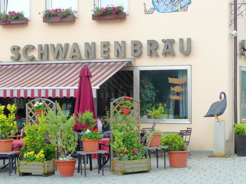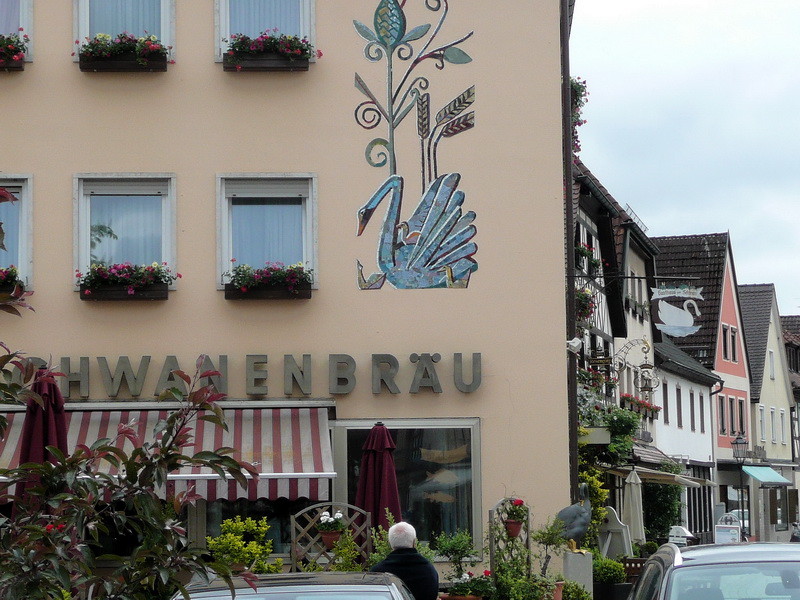 Natürlich steht beim „Schwanenbräu“ auch ein Schwan vor der Tür – und an der Fassade