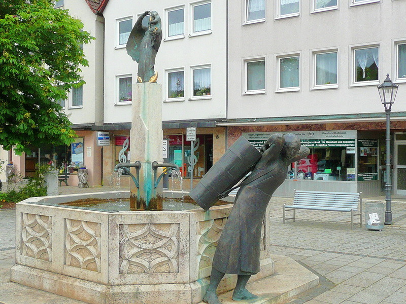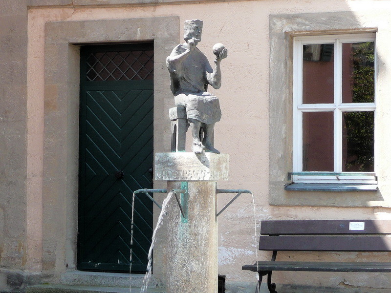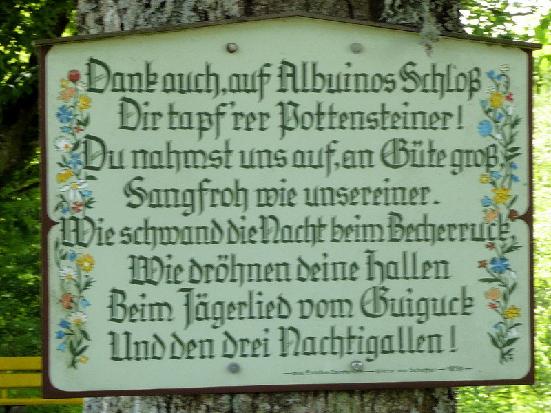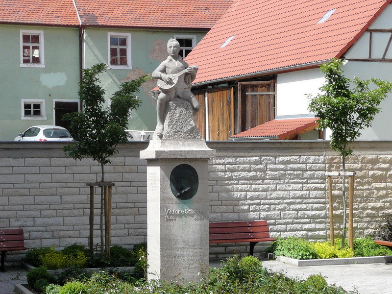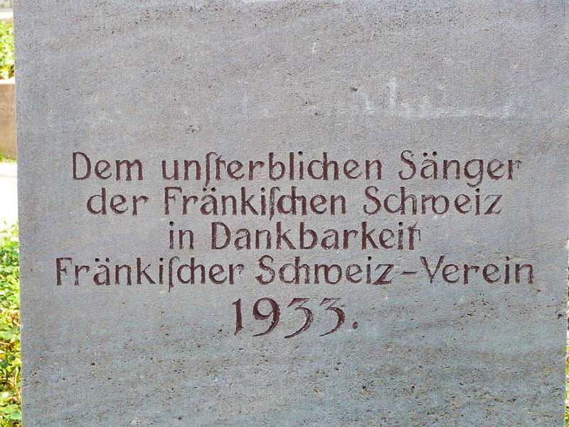 Am Marktplatz befindet sich auch das „Viktor von Scheffel Denkmal“, dem Dichter des Frankenlieds. Klar wird der hier verehrt, er logierte in Gößweinstein anläßlich einer Kur. Von ihm ist ein Eintrag ins Gästebuch überliefert :
