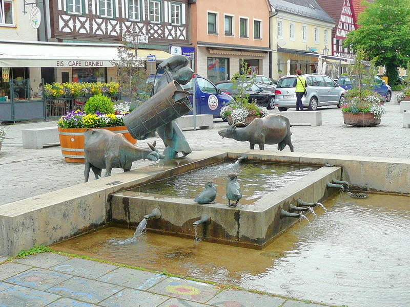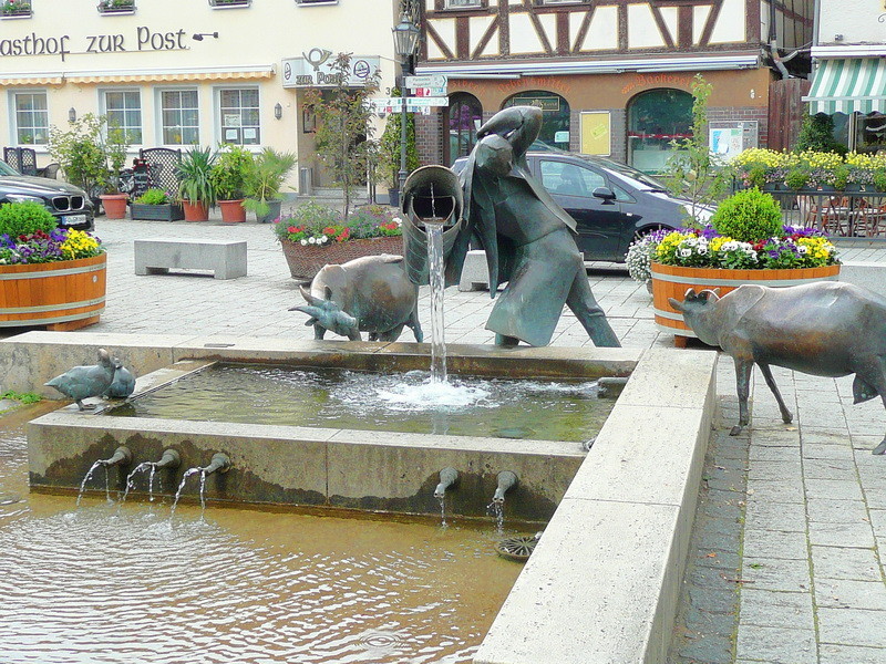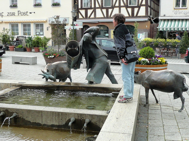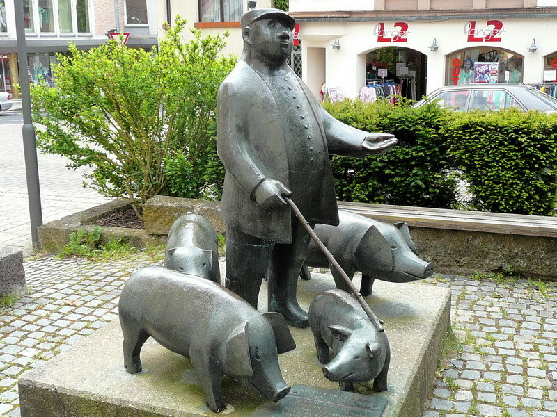 Am Zugang zur Altstadt – dem ehemaligen Schweinemarkt – steht das Denkmal eines Schweinehirten, der seine Schweinchen verkaufen möchte und die Hand zur Bezahlung aufhält.