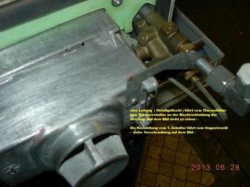 Hallo, ist also bis 31.12.2014 gültig und ist somit am HU Tag nicht Prüfungsrelevant. Kommt auf die genaue Einbauposition deiner Heizung an. Ausgebaut ist es natürlich leichter an das Thermoelemnt zu kommen. bert Hallo, Anfang Juni war ebenfalls eine Frage nach defekter Truma im Netz. Suche mal unter der Rubrik SUCHE: : Gasheizung defekt ? Truma S 3002 K Dort findest Du genug Informationen. Aber gerade zu diesem Thema gibt es viele Fehlerursachen, die immer wieder genannt werden ( vom Drehschalter bis zu Verschmutzung bei der Gaszufuhr und vom Thermoelement am kleinen Schalenbrenner, dort wo die Zündflamme zu sehen ist. ) Ich tippe auf das Thermoelement ( Fühler an der Zündflamme ). Auswechslung nur bei Demontage der kompletten Heizung, was aber Werkstattsache ist. Muß aber jeder für sich entscheiden Versuche mal zunächst den Thermoschalter ( seitlich an der Heizungsverkleidung ) zu überbrücken. Ansonsten informiere Dich mal zu dem o.g. Thema, wie ich eingangs angedeutet habe. vom linken Niederrhein Manfred Hallo Manfred Ja den Bericht habe ich schon gelesen, aber leider geht nicht daraus hervor was denn letztendlich defekt ist oder war. Leider werden häufig Berichte nicht zu Ende geschrieben (will mich selber da nicht ausschließen). Ich habe mir heute, von unten die Heizung angeschaut, außer einer Drahtklammer (sicherung?) ist nichts was abgeschraubt werden kann um an das Thermoelement zu kommen Ich fürchte, das ich die Heizung ausbauen muß. Andreas Hallo Andreas, richtig war es schon, dass Du die untere Klammer gelöst hast. Wenn also keine Verschmutzung in dem Ansaugteil vorliegt und auch keine Verstopfung der beiden Gasröhrchen zum Schalenbrenner vorliegt, kann, muß es aber nicht am Thermoelement liegen, seltener am Magnetventil, wo eine Drahtgeflecht Leitung verschraubt ist. um an das Thermoelement auszubauen, muss die komplette Heizung ausgebaut werden. Das bedeutet. 1. den Gasanschluss lösen 2. die Stromverbindung lösen 3. den Abgaskamin lösen -danach m u ß aber eine neue Silikondichtung ( O-Ring ) montiert werden - 4. die komplette Heizung ausbauen 5. den Wärmetauscher demontieren ( 4 Inbusschrauben ) 6. die Messingverschraubung mit dem Leitung mit Drahtgeflecht lösen ( später: bei Einbau des neuen Ersatzteiles mit Vorsicht wieder einschrauben. 7. Kontermutter des Thermoelementes lösen und komplettes Teil ausbauen. 8. Den Thermoschalter am Heizungskasten ebenfalls lösen. Bei Einbau des neues Teiles in umgekehrter Reihenfolge vorgehen. Ich hoffe, dass ich mich bei der Reihenfolge nicht vertan habe. In meinen Kommentaren zu dem erschienenen Thema habe ich ja mal Bilder gezeigt. Auf Wunsch kann ich noch andere Bilder zeigen. Auf Folgendes möchte ich aber unbedingt hinweisen: 1. Ich muß nicht Recht haben, wenn der Fehler am Thermoelement liegt. Es ist eine Vermutung von mir, die darin begründet liegt, dass der gleiche Defekt an meiner Heizung im verg. Jahr lag. Ein Techniker hat mit telef. gesagt, dass ich zuerst einmal den Thermoschalter überbrücken sollte. Wenn das auch nichts nützt, so kann - seiner Vermutung nach - nur das Thermoelement am Schalenbrenner die Ursache sein. Das war es auch. Hatte dem Techniker die gleichen Angaben gemacht wie Du das uns im Forum auch geschildert hast. 2. Das, was ich jetzt geschrieben habe sollte nicht als Aufforderung zur Selbsthilfe sein. Ich habe die Reparatur selber ausgeführt, es hat einwandfrei funktioniert. Das gilt aber nur für mich und sollte keine Aufforderung für andere Personen sein. . In der Regel sollte das eine Aufgabe für eine Werkstatt sein, die anschließend auch für ordnungsgemäße Arbeit haftet. 3. Somit gelten meine Ausführungen lediglich dazu, dass man über erforderliche Arbeitsschritte informiert ist und man Bescheid weiß, was eine Fachwerkstatt macht. Reine Ersatzteilkosten liegen bei ca. 105 €. Ich schätze mal, dass eine Werkstatt noch einmal für die Reparatur 1,5 Std. berechnet -nur eine Schätzung von mir - . Ich stimme Dir zu, was letztendlich die seinerzeitige Fehlerursache war und was es dem Forummitglied gekostet hat. Es ist sehr häufig der Fall, dass man keine Nachricht erhält wie die Sache ausgegangen ist. Schade eigentlich, aber es ist nun mal so. vom linken Niederrhein Manfred Hallo Manfred Erstmal vielen Dank für die ausfürliche Anleitung und ja es wäre prima wenn Du noch Bilder einstellen würdest. Nun ich denke das es kein Problem sein wird die Reparatur durchzuführen, ich war 17 Jahre Schlosser und nun M-Techniker. Trotzdem ist es enorm hilfreich wie hier im Forum so tolle Tipps zu erhalten und auch Vorgehensweisen zu erfahren. Dafür ein Dank an alle die mir schon oft weitergeholfen haben. Merci und aus Bergkamen Andreas Hallo Ich hätte noch eine Frage zum Thermoschalter, wie wird dieser denn überbrückt? Danke vorab, MfG Andreas Hallo Andreas, habe gerade Deine Nachfrage gelesen. Bei Truma nennt man diesen Schalter Thermoklick, soviel ich mich erinnere. Im Normalfall ist dieser Schalter eingeschaltet. Erst wenn eine entsprechend hohe Temperatur an der Heizungsverkleidung auftritt, schaltet er aus. Die Schalttemperatur ist auf dem Schalter vermerkt. ( Schalttemp. zwischen 100 und 135 Grad, unterschiedliche Angaben habe ist festgestellt ) Durch die Leitung mit dem Drahtgeflecht fließt vom Thermofühler ein minimaler Strom ( bedingt durch die Wärme am Thermofühler an der Zündflamme ) über den Thermoschalter und weiter zu dem Magnetventil. Dieser Vorgang hat eine bestimmte Bezeichnung, die ich einmal wußte. Spannung liegt bei ungef. 30 mV, reicht aber aus, um das Magnetventil für die Gaszufuhr zum Schalenbrenner freizugeben. Vielleicht erklärt jemand aus dem Forum diesen Vorgang wissenschaftlicher. Das muss ich auch nicht wissen. Wenn also der Schalter defekt sein sollte ( in der Regel wohl selten ) verbindest Du einfach die beiden angelöteten Kabel ( rechts und links ) miteinander. Aber wie gesagt: nur ein Versuch. Ich tippe aber nach wie vor auf ei