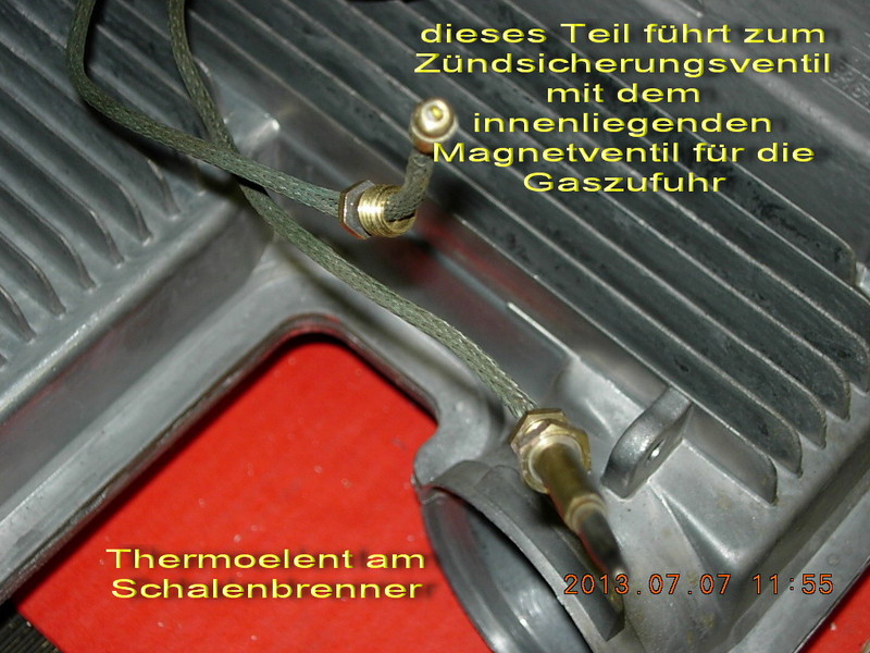 Hallo, technisch kann ich dir jetzt nicht helfen aber wie lange hast du denn noch eine gültige Gasprüfung? So lange die noch gültig ist hat das mit der Tüv Abnahme nichts zu tun. Das könnte das Thermoelemt sein. Das schließt nach kurzer Zeit das Gasventil wenn die Flamme ausgeht. Wenn du dich selbst dran wagen willst eigentlich nicht schwer zu tauschen. Nur eben eine Fummelei. Vorher noch prüfen ob die Zündgasflamme ordentlich auf das Thermoelement brennt. Eventuell Spitze begutachten ob sauber/ nicht verzundert. Kontakte auch ansehen, eventuell reinigen und nochmals überprüfen. bert Erstmal Danke für die Antworten Die Gasprüfung gilt noch für 2014. Muß dafür die Heizung ausgebaut werden oder kommt man so an das Thermoelement? Werde morgen mal versuchen alles zu säubern wo ich dran komme. MfG