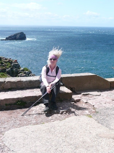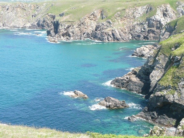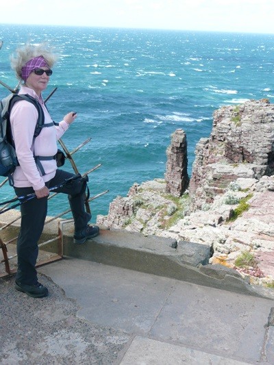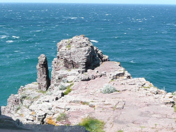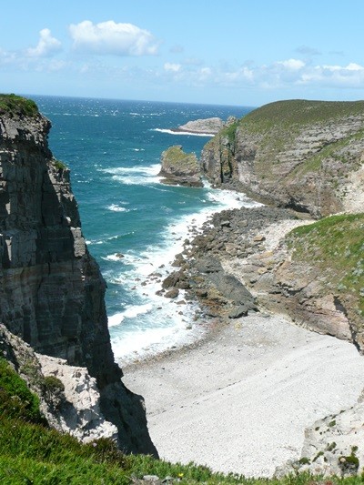 Wir wandern auf dem Küstenwanderweg entlang Richtung Kap Fréhel mit tollen Blicken auf die wind- und wassergepeitschten Felsen, kommen am „Teufelsloch“ vorbei und erreichen das Kap.