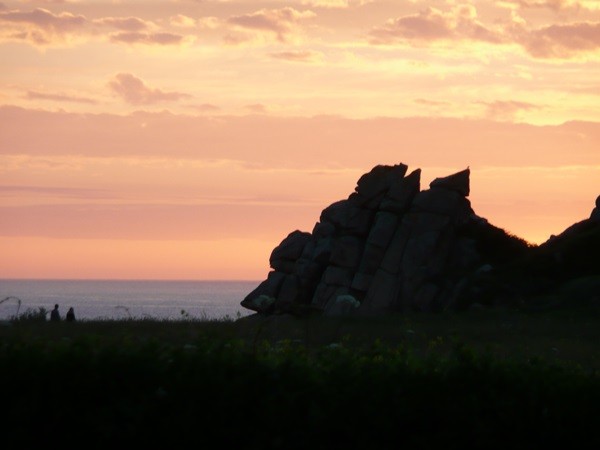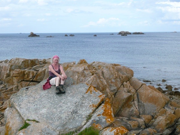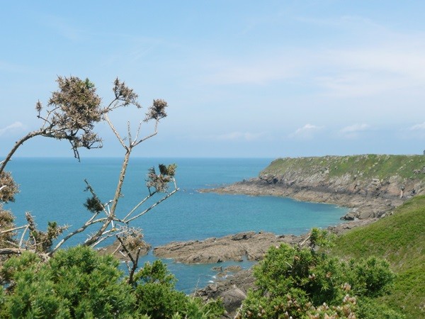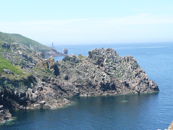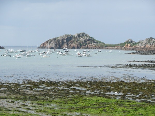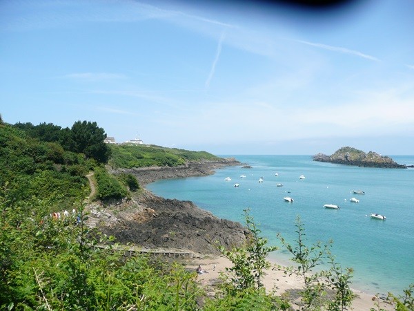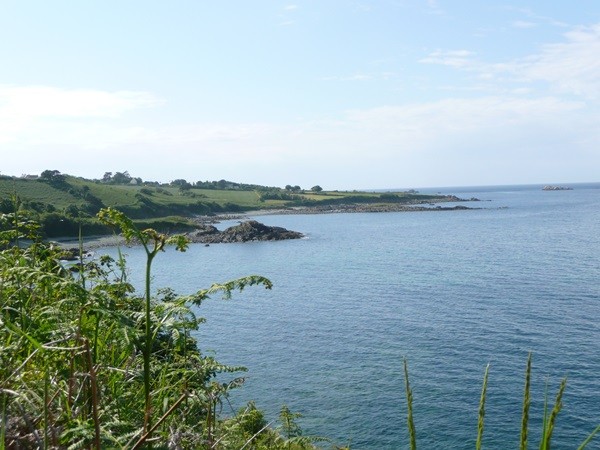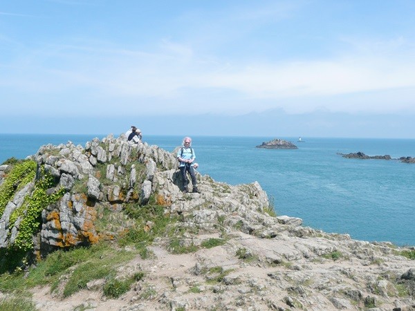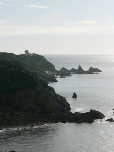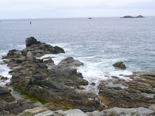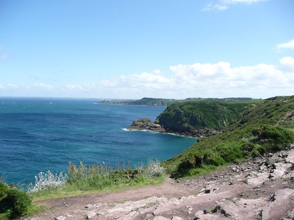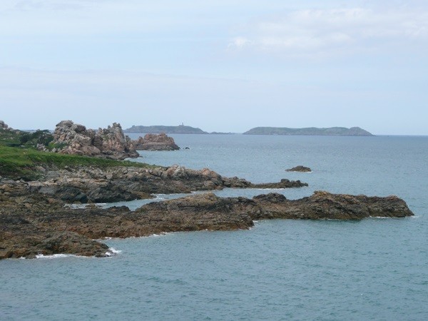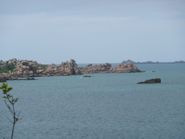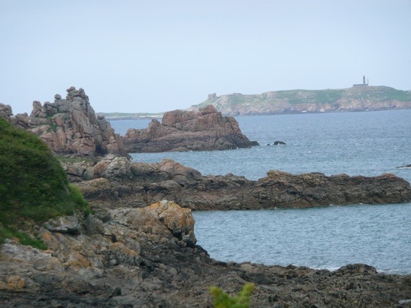 Nachdem es zuerst sehr bewölkt war, kam nach dem Frühstück die Sonne raus und wir machen uns auf den Weg und wandern zuerst zur Kirche, durch den Oberort und dann zum Küstenwanderweg. Hier haben wir wieder schöne Ausblicke auf die Küste, die vorgelagerten Inseln, nach Port Pican und zum Pointe du Chartry. Wir kommen durch Port Mer zum Pointe de Grouin, wo wir mit herrlicher Aussicht ein Picknick machen.