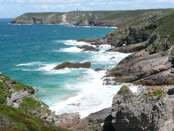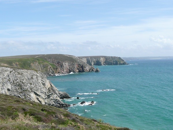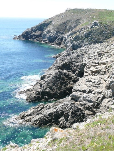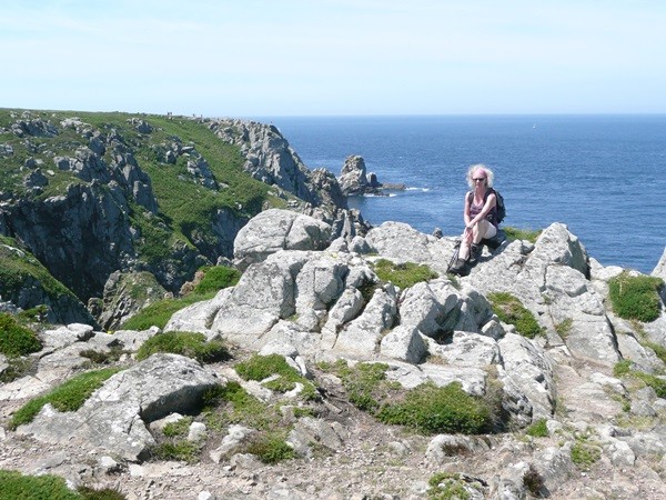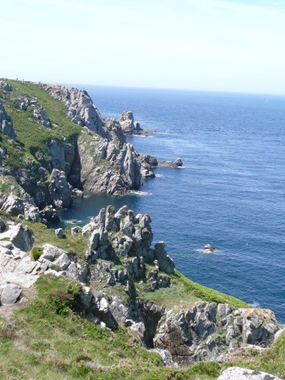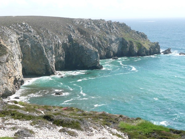 Wir fahren weiter, kaufen unterwegs ein und erreichen mittags Pointe du Van. Auf dem Parkplatz, der auch als Übernachtungsplatz für Wohnmobile genutzt werden kann, gibt es einen Brunch, dann starten wir unsere Wanderung und gehen, wieder mit den schönen Ausblicken, an der Küste entlang Richtung Pointe du Castelmeur. Dieser schöne, teilweise schmale Weg, führt über steile An- und Abstiege an atemberaubenden Schluchten vorbei zum Kap. Hier bewundern wir, wie sich das Farbspiel in jeder Bucht ändert.
