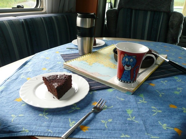 Auf dem CP Municipal de la Mer (Tipp von Gogolo, danke) finden wir einen schönen, einigermaßen geraden Platz mit schöner Aussicht und genießen diese mit Kaffee und Kuchen.
