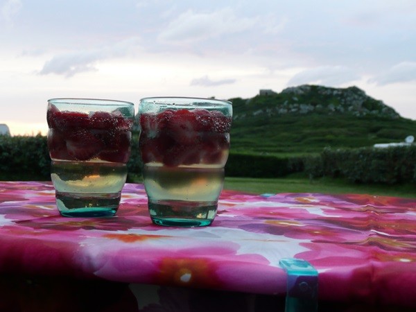 Wir richten uns ein und machen danach einen Rundgang über den Platz und durch die Dünen. Plötzlich fängt es an zu regnen, wir werden nass bis auf die Haut, also schnell zurück zum Wohnmobil. Zum Abendessen gibt es eine Terrine von Jakobsmuscheln mit gelben Tomaten, dazu Baguette und danach Sülze mit Bratkartoffeln. Dazu einen leckeren Cidre.