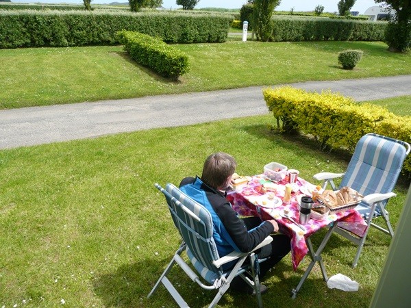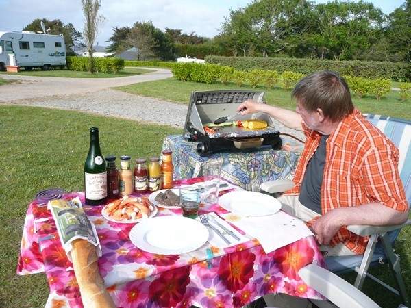 Wir überlegen kurz, hier zu übernachten. Aber da Dieter lieber etwas weniger eng stehen möchte, fahren wir nach Plogoff auf den Camping Municipal, essen einen Tomaten-Mozarella-Salat mit Garnelen und haben einen schönen Abend vor dem Mobil und eine ruhige Nacht.
