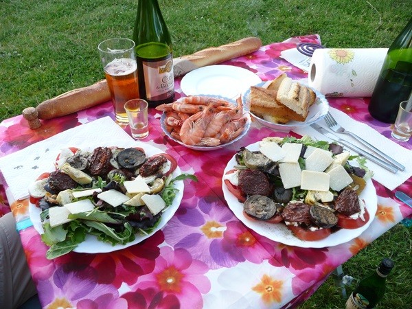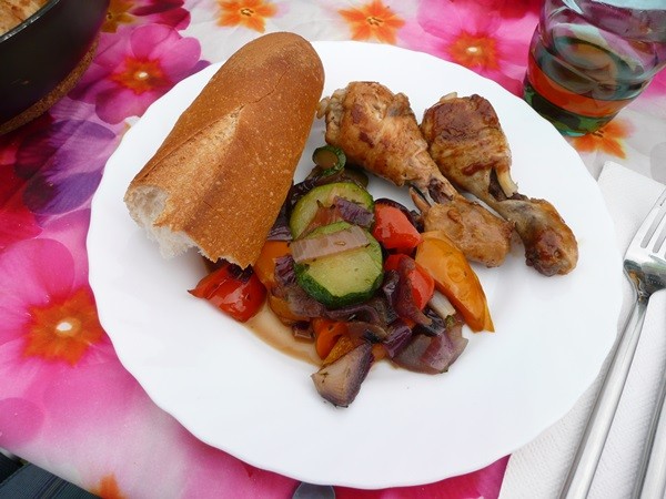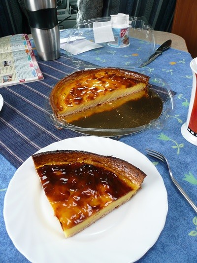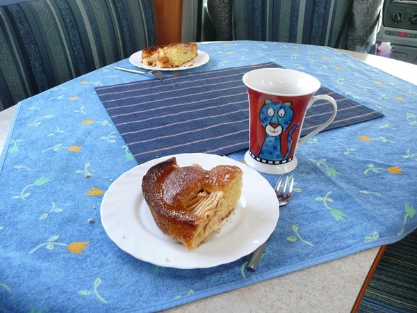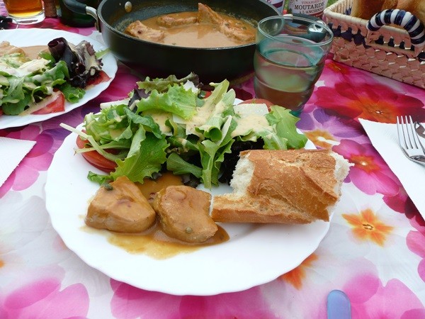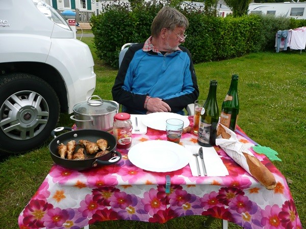 Auf dem Rückweg kaufen wir Baguette und können sogar zum essen draußen sitzen. Es gibt Hühnerbeinchen, Ratatouille und Baguette, dazu Cidre und als Nachtisch Kuchen. Welch ein tolles Leben.