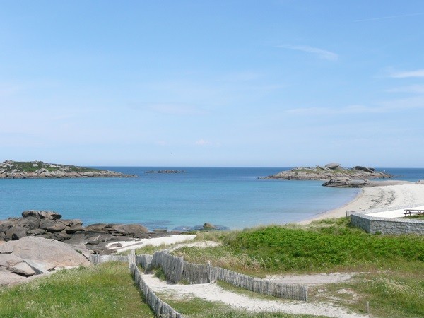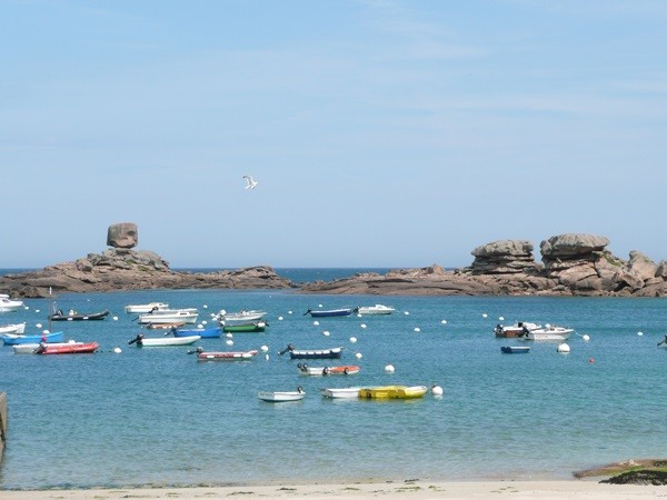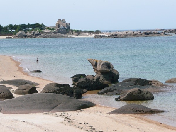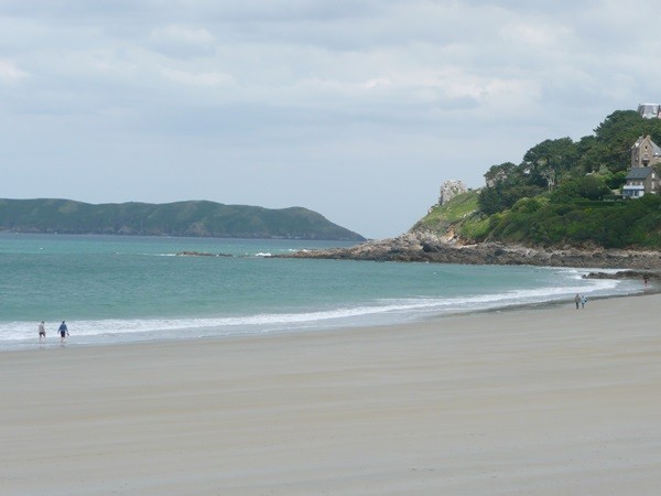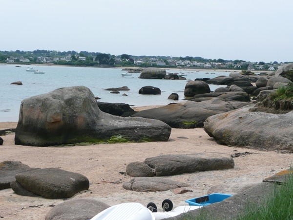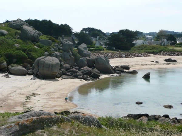 Hier beginnt unsere Wanderung entlang der Côte de Granit Rose entsprechend dem Vorschlag 16 im Rother Wanderführer Bretagne. Unsere Bushaltestelle ist Ste-Anne. Wir gehen zuerst zum Strand La Grève Blanche, wo unsere Wanderung auf dem GR 34, dem Zöllnerpfad, beginnt.