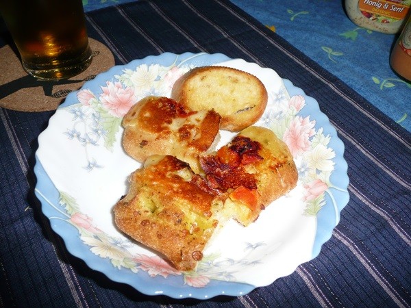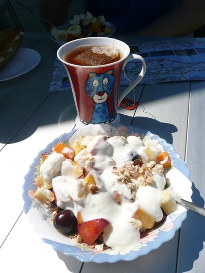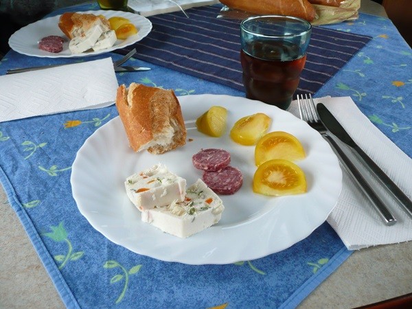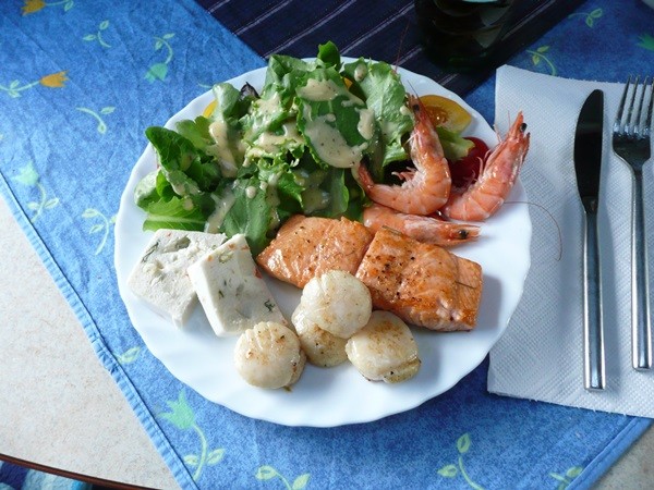 Das Wetter hält sich, so dass wir wieder draußen sitzen können. Zum Abendessen gibt es noch einmal eine Fischplatte mit Baguette und Salat. Die Sonne versucht auch noch einmal, uns den Abend zu verschönern.