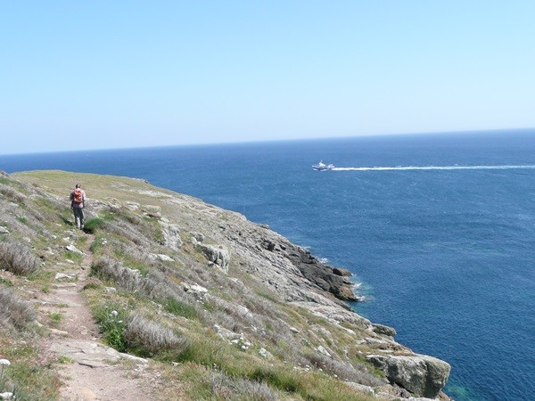 Wir gehen weiter, wieder auf dem hier sehr schönen Küstenweg durch eine Heidelandschaft, vorbei an steilen Klippen, haben spektakuläre Ausblicke, schauen in kleine Buchten und erreichen den Port Bestrées, leider ohne Hafenkneipe.