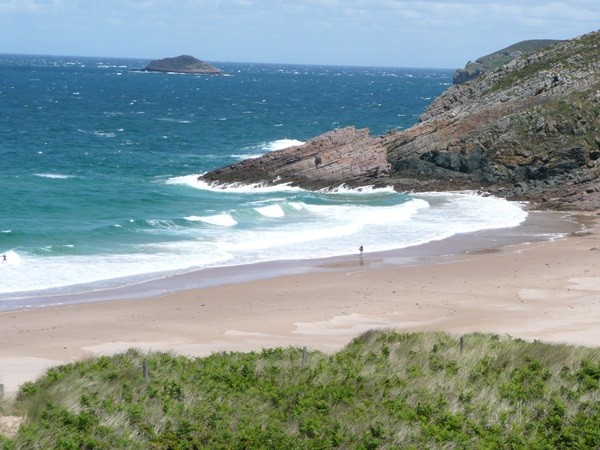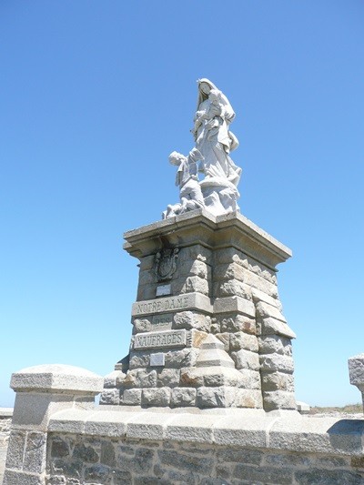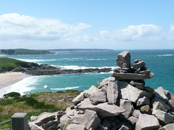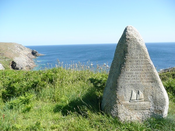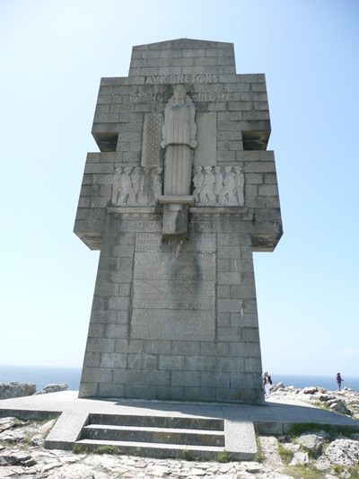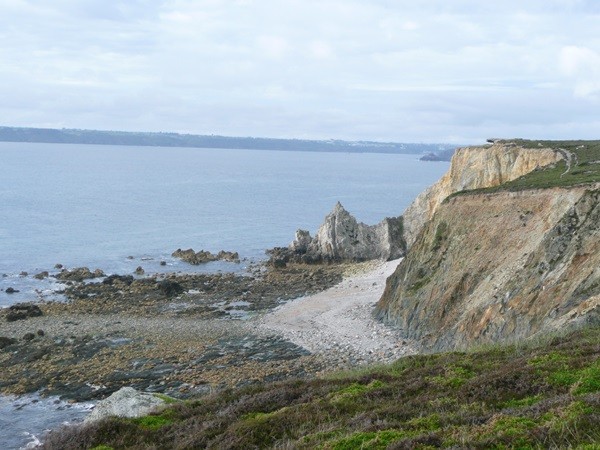 Anschließend erreichen wir den Anse de Pen Hat, ein herrlicher Strand, aber vom Baden wird wegen Treibsand abgeraten. Uns wäre es sowieso zu kalt gewesen. Am Ende des Strandes geht es wieder bergauf. Wir erreichen ein Militärmuseum, wo an den 2. Weltkrieg erinnert wird und dann das Denkmal für die im Krieg gefallenen Bretonen. Wir sind nicht so sehr am Kriegsgeschehen interessiert, sind aber doch wieder berührt, wenn wir an die vielen Gefallenen jungen Menschen denken. Belohnt wird diese Wanderung auch auf diesem Teilstück von herrlichen Blicken auf die Klippen.
