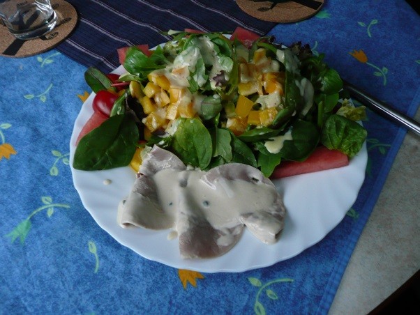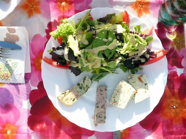 Es war eine sehr abwechslungsreiche Wanderung, mediterranes Flair auf dem Küstenabschnitt von Cancale zum Kap, etwas wilder auf der Nordseite. Abends gibt es noch einen Salat mit gebratenen Würstchen und Fladenbrot.