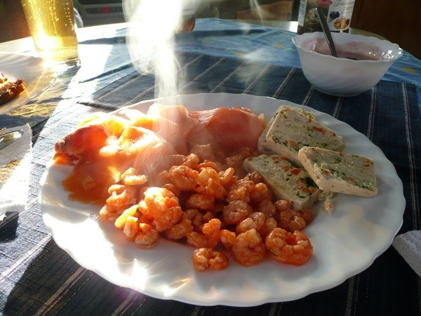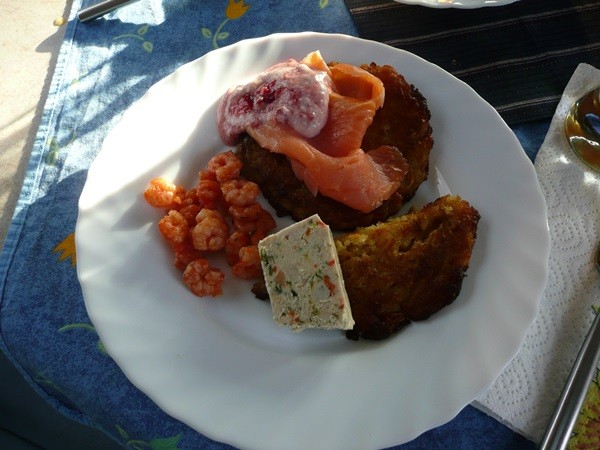 Nachdem wir uns eingerichtet haben und die Sonne sich auch sehen lässt, machen wir noch eine kleine Küstenwanderung , dann gibt es Abendessen: Reibeplätzchen mit Lachs, Shrimps und Jakobsmuschelterrine. Die Sonne hält sich.