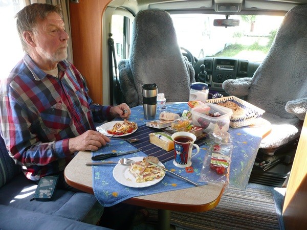 Wir gehen durch den Ort zurück, kaufen unterwegs Baguette und eine Quiche mit Lachs. Das Abendessen vor dem Wohnmobil mit der Lachsquiche mit Salat und anschließender Käseplatte krönt den Tag. Anschließend sitzen wir noch lange mit Gabi und Edgar, die wir am Tag zuvor beim Wandern getroffen hatten, vor dem Wohnmobil und tauschen Erfahrungen aus.