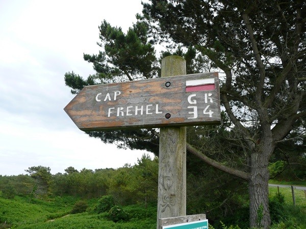 Zuerst gehen wir nach Fréhel und von dort nach ‚Sables-d’Or-Les-Pins, einem Ort, wo 1/3 der Häuser und Hotels zum Verkauf angeboten werden und leerstehen. Wenn sich nicht ganz schnell etwas ändert, ist dieser Ort dem Untergang gewidmet, trotz der schönen Badebucht.