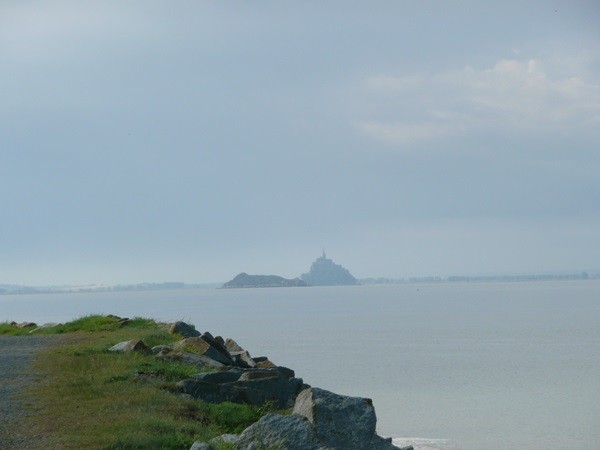 Mix aus Wolken und Sonne. Wir gehen zum Strand und werfen einen letzten Blick auf den Heiligen Berg. Adieu Bretagne, Adieu Normandie.