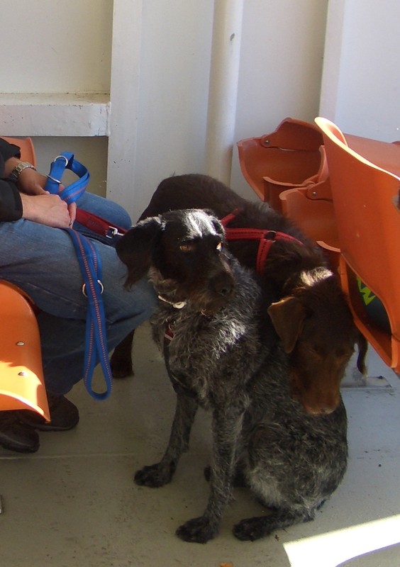Wir durften aussteigen. Toll. Nicht so toll fanden meine Kumpeline und ich die Eisengittertreppe. Da haben wir uns doch glatt geweigert die zu benutzen. Hat sich gelohnt, wir durften auf den Arm. Oben saßen schon ganz viele Menschen und Vierbeiner. Wir haben uns einfach in eine schattige Ecke gesetzt. Bruna mag so Menschenansammlungen nicht, ich fand es spannend. Leider durfte ich nicht so wie ich wollte. Spielverderber.