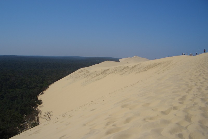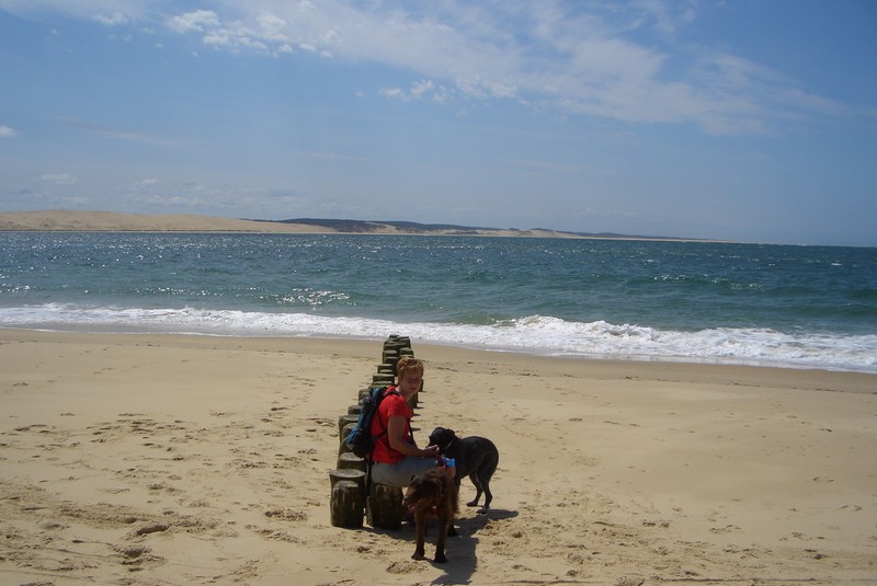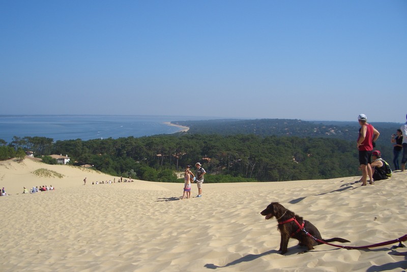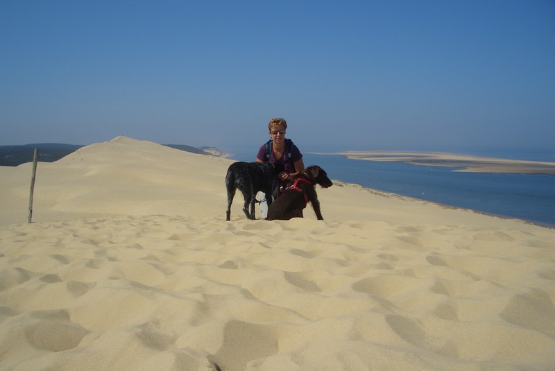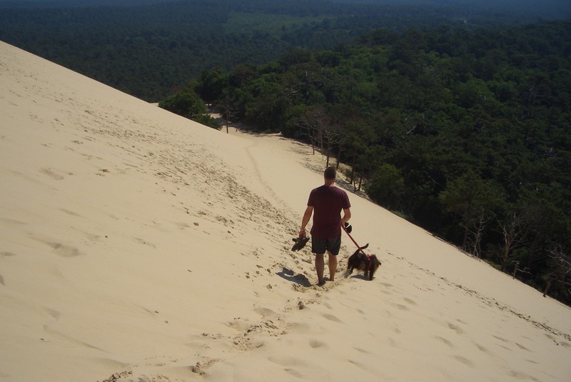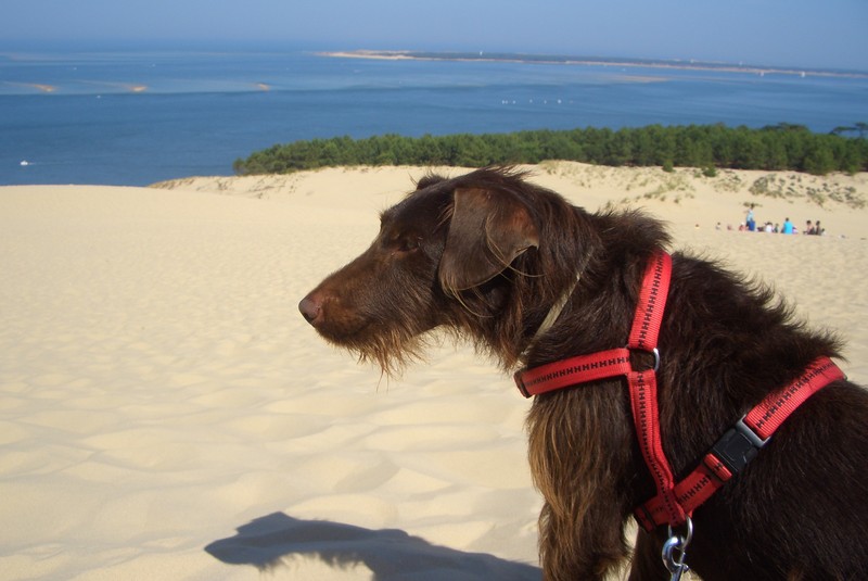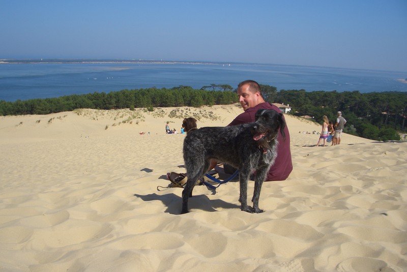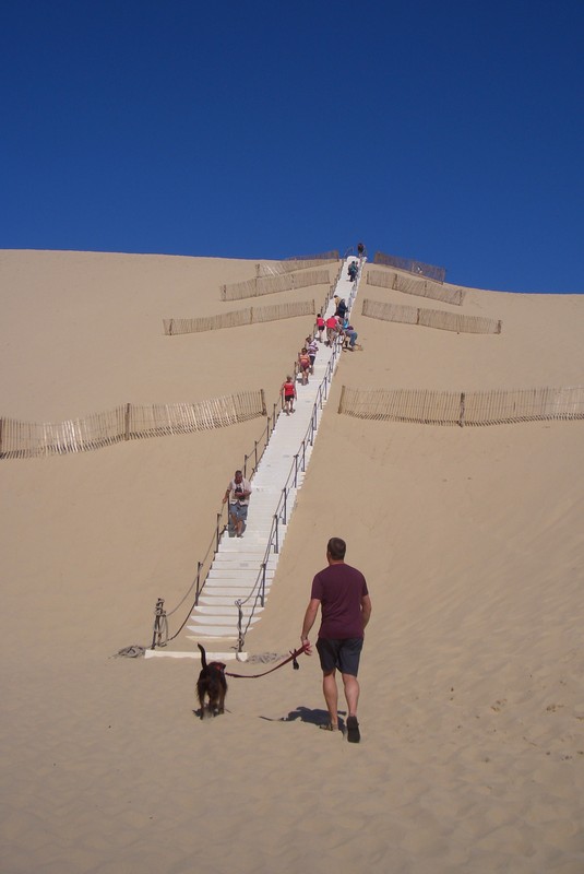 Boah, das nenne ich mal einen Sandhaufen. Die „Dune du Pilat“ hat sogar eine Treppe. Nix wie rauf da, Herrchen am Ende der Leine hab ich dabei ganz vergessen.