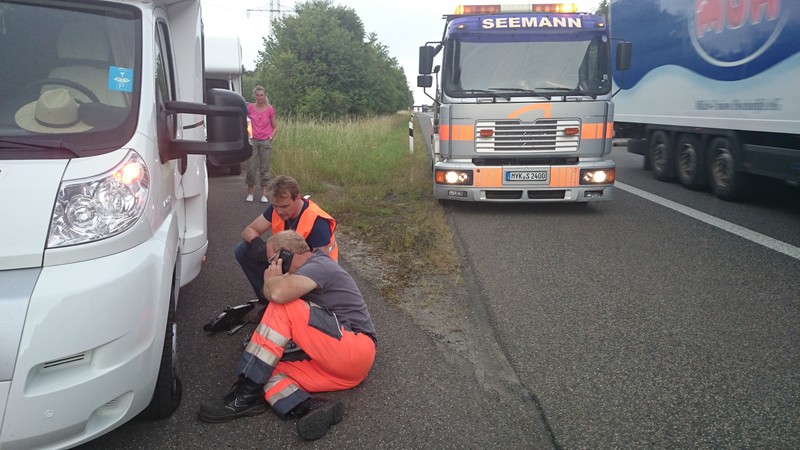 Schock war natürlich erst mal groß, mitten auf der A48 ein Riesenknall und Reifen dahin....Zum Glück ist aus dem (schlauchlosen) Reifen die Luft zwar schnell entwichen aber noch so, dass wir noch heil ohne große Ausbrecher auf den Randstreifen gekommen sind. Dann das erste Mal so wirklich realisiert, dass unser neuer Forster ja keinen Ersatzreifen hat, sondern nur ein Notfallreparatur Set (diese mit dem Kompressor) . Dieses, paar Monate alt und frisch aus der Verpackung geholt, funktionierte NICHT - ja, wir haben die Anleitung begriffen :-)