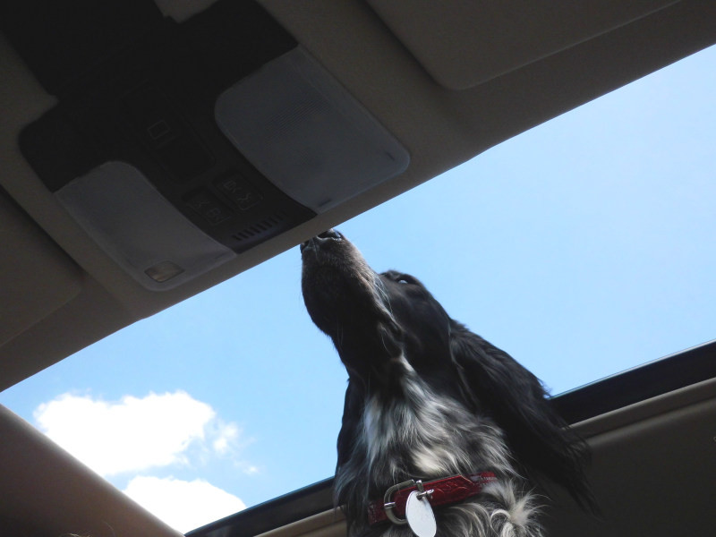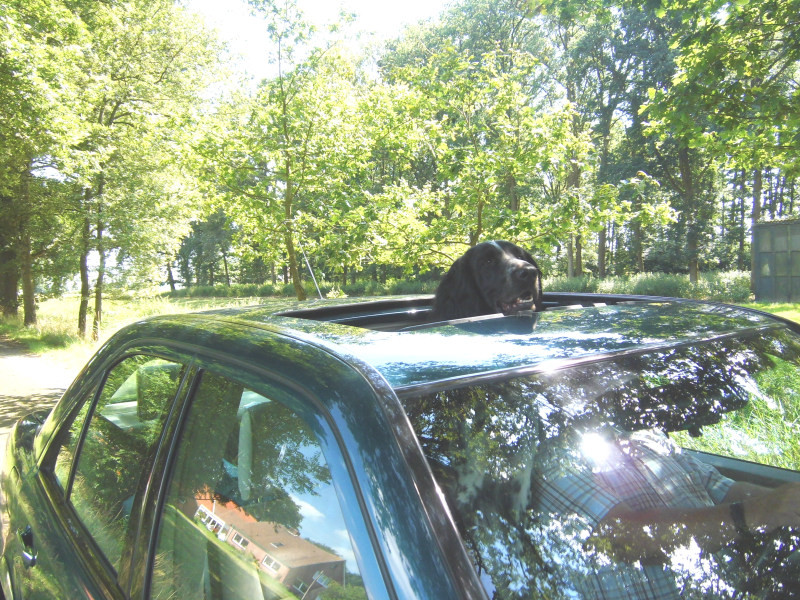 " Also, Leute- ich fahre sehr gern mit Herrchen Auto ! Am liebsten spiele ich "Panzerkommandant" ! Dabei halte meinen Kopf aus dem Schiebedach und lasse mir bis etwa 100 Sachen so richtig Lefzen und Ohren durchpusten... Nur wenn ein großer Laster von vorn kommt, ducke ich mich mal fix nach unten, weil der Luftdruck immer so "BUMMS" macht, was ich nicht so gern habe. Am Besten sind Kurven- da kann ich mich immer so schön schräg hineinlegen.... :D