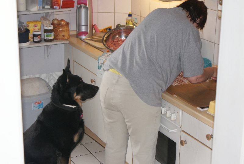 Er passt nur auf.... :) Und wie der aufpasst! ;D Das macht unserer auch ganz toll - und die Kinder sagen immer er würde betteln - nee, nee, nee.