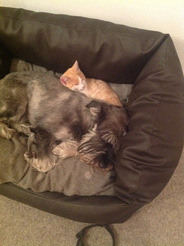Leider hat sie die rassetypischen Krebszehen. Inzwischen hat sie schon 6 Zehen weniger und so wie es aussieht ist schon wieder einer fällig. Das macht uns Menschen natürlich sehr traurig, aber sie nimmt es mit einer unglaublichen Gelassenheit und ist immer gleich glücklich. Liebe Nina und ich stell mal ein Bildchen rein von unserer "Katzenmama", die Kätzchen Lilly perfekt adoptiert hat. Einträchtiges Schlafen zusammen im Hundebett. Das Bild ist nur etwas körnig, es war schon dunkel:)