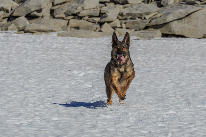 Wie schön. Freunde meiner Tochter haben ihren Malinois nach einem Jahr traurig an einen Hundeführer bei der Polizei abgegeben. Seitdem ist er ausgeglichen und ein wunderbarer Hund. Der Hundeführer ist begeistert. Wir denken, er war im Kopf völlig unterfordert und dadurch aggressiv. Der Mali ist ein Arbeitshund. Ein berufstätiger Hundehalter, 8 Stunden + Pause und Fahrzeit zur Arbeit sind 10 Stunden vom Tag mal abgeschrieben. Familie, Kinder, Auto, Hobby, einkaufen usw. kann dann noch unabhängig vom Wetter behaupten, das er 2-3 Stunden sich artgerecht jeden Tag dem Hund widmen kann. Malis kommen im Körperaufbau dem Wolf sehr nahe. Ein Wolf wird in der freien Wildbahn 12-14 Jahre alt ohne Tierarzt. Zur Nahrungsaufnahme legt er im Schnitt jeden Tag 50km zurück und frisst jeden scheiß. Läuft bis zu 65km/h. Dann wird sich so ein athletischer Hund angeschafft und verliert durch das Spazieren gehen (3-5km/h) bald seine tollen körperlichen Eigenschaften. July läuft z.B. im Abstand von 5-10 Meter vor dem Rennrad locker 57km/h, dreht sich alle paar Meter noch dabei immer wieder um. Allerdings kann ich nicht schneller, für mich ein Sprint den ich auch nur 200 Meter fahren kann. Das macht dem Hund nichts aus, er liebt diesen Sprint sehr, den wir fast täglich machen. Herrliche leere Radwege laden in der Umgebung hierzu auch ein. 6 mal die Woche sind wir mit dem Rad unterwegs. Der Hund läuft voraus und ich hinterher. Ein leises bei Fuß und sie läuft 5cm neben neben meinem Bein, so als würde ich zu Fuß gehen oder laufen. Ihr natürliches Grundtempo lag bis 12-15km/h als sie 5-7 Monate alt war, heute mit 10 Monaten liegt das bei 20-25km/h. Ich drossel das Tempo auf ca. 20km/h, da sie oft über die Wiesen quer rennt und alle Gräben ständig überspringt. Meist sind wir nach 2 Stunden (40 Tacho KM) wieder am Startpunkt, aber July hat einiges mehr erlaufen. Bei unseren Nachmittägigen Sparziergängen interessiert nur der Tennisball und die Frisbeescheibe, die sie stundenlang bringt, das mein Arm an seine Grenzen treibt. Sie geht nicht ins Wasser, sie hechtet ins Wasser. Ob körperlich oder geistig ausgelastet, wenn ein Arbeitshund nicht jeden Tag 20-23 Stunden vor sich hin vegetieren muss, ob im Büro, Zwinger oder in der Wohnung auf dem Ledersofa oder im Garten sich nur mit vorbeilaufenden beschäftigen darf, dann hat man auch mit mit Malinois kein Problem. Die meisten langbeinigen Hunde werden leider nicht artgerecht gehalten, man schimpft über den Tierzoo, aber dort geht es den meisten Tieren noch besser wie vielen Hunden was die körperliche Auslastung betrifft. Was erlebt man jeden Tag mehrmals, ein angeleinter Hund zieht und bellt und der Hundehalter steht machtlos daneben. Das Zeugnis stellt sich dabei jeder selber aus, es nicht der Hund, es ist die Unfähigkeit des Halters dies zu unterbinden, es sind leider immer Armutszeugnisse. Und trotzdem viele Hund nicht ausgelastet sind füttert man sie wie ein Hochleistungssportler, beim Hund mit rohem Fleisch, damit der nicht ausgelastete Hund noch mehr am Rädchen drehen kann. Ja, ich kenne leider viele Malinois die auch in der Wohnung im Käfig dahin Vegetieren müssen, da sie im Alleinsein die Möbel verschönern und eigenartige Verhaltungsweisen an den Tag legen. So wie meine 68 jährige Nachbarin, die hat eine nun 16 Monate alte bildschöne sehr große Windhündin, die hat ihren Hund noch nie hecheln gesehen hat sie mir erzählt, läuft nur angeleint, da der Hund nicht kommt wenn sie ihn ruft. Ich habe mir bewusst diese Rasse ausgesucht die meinem Tagesumtrieb gerecht werden kann. Bin sehr Glücklich mit dem Hund. LG Toller Text den Du da geschrieben hast. Deine Liebe zu July liest man in jedem Satz. Oh, ja. Und sie hat ein gutes Leben bei Dir. Ok. Den letzen Absatz empfinde ich nun etwas eindimensional (Überheblichkeit in Sachen Erziehung hab ich mir gründlich abgewöhnt) und Hund vorm Laden finde ich wirklich sehr mutig (weil die neuerdings allenthalben gestohlen werden..noch dazu solche Prachtexemplare), aber die July ist wirklich ein bildschöner Hund und bei Dir ganz offensichtlich in sehr guten Händen. Monika...wie wahr...das habe ich in Jägerforen, in die ich ab und zu mal hinein spinxe auch schon gelesen. Absolut krass diese Haltung..bin ich ganz bei Dir! Liebe July, ich habe selber zwei Hunde ( Jagdhunde) und frage mich die ganze Zeit ob Du uns hier auf den Arm nimmst? Deine Texte habe ich mit entsetzen gelesen. Du fährst Rad mit einem so jungen Hund über so viele Kilometer? Ein Tierarzt würde die Hände über dem Kopf zusammen schlagen, ein Hüftschaden wird Deinem Hund sicher sein. Dein hochsensibler Malinois würde sich sicher zur Auslastung über Kopfarbeit freuen und nicht über ein Training wie es sonst nur Rennpferde haben. Im übrigen bekommen meine Hunde ihr Leben lang rohes Fleisch und sind denkbar gesund. Ich kann nur mit Kopf schütteln über so viel Unwissenheit und mit tierliebe hat das nichts zu tun. Und ich über soviel Dogmatismus, lieber Stefan. Gilt immer für alle Hunde das gleiche und Barf ist überhaupt das einzig wahre, gelle? So jetzt mal wieder zurück zum Thema, wir sind ja in der Hundegalerie. Wir waren in Norwegen in Urlaub und auf dem Dalsnibba fanden wir ein Schneefeld :D Die Gelegenheit für ein Schneeshooting im August: ![]() ![]() Unser Kater war auch wieder mit, erstmalig über 4 Wochen, aber das hat gut geklappt mit ihm, er ist ja in Köln Freigänger. Er ging an der Leine raus, wo es ruhig war und ansonsten war zufrieden damit, die gesamte Nacht draussen die Welt zu beobachten. ![]() Und so herzerweichend guckt Carl, wenn er Kartoffelsalat haben will. Er ist ein armer Tropf. ![]() Und ja, er wird teilgebarft, ist aber ein anderes Thema, und nein, er hat keinen Kartoffelsalat gekriegt, nicht dass noch einer den Tierschutz anruft :kuller: Und auf den Tisch durfte er nur fürs Foto ;D Er ist gut erzogen :kuller: Es war grad heute beim ersten Abendessen der Urlaubsreise. Da lassen wi