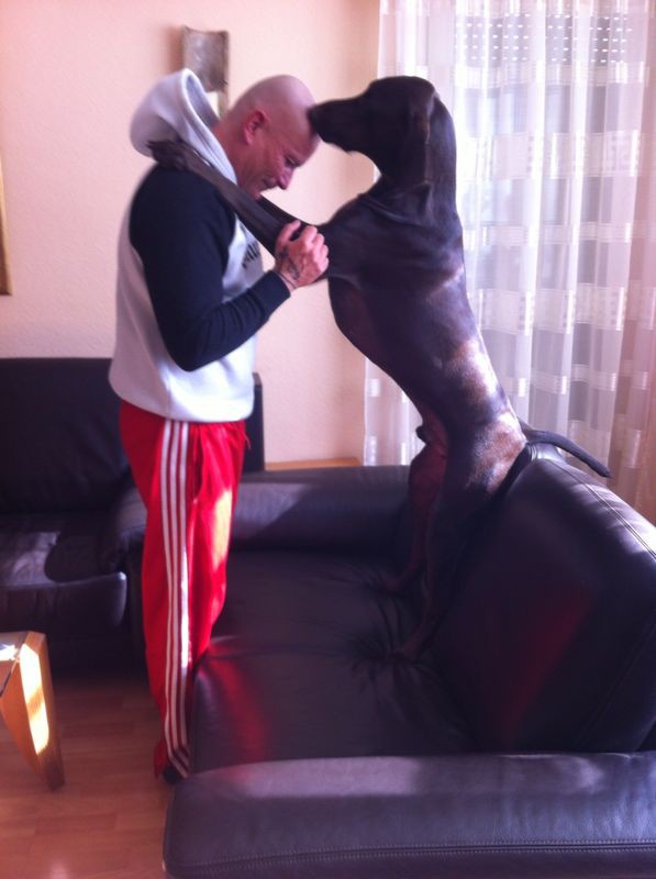 Süüüß :D Und so schöne Augen. Bin ganz hin und weg :love: Eine Straßenmischung aus Teneriffa ist Lilly auch. ![]() UK ist ein Ungarisch Kurzhaar (Magyar Vizsla), DK ein Deutsch Kurzhaar. Jagdhunde. Hallo Ingrid Hallo Danny, zuerst mal ich gehe Gassi mit Luna auf der linken Seite des Rheins "Niehl - Niehlerdamm und Umgebung" So nun zu den Abkürzungen UK bedeutet Ungarisch Kurzhaar und DK bedeutet Deutsch Kurzhaar. Luna und Drago sind Hunde der Rasse Magyar Vizsla, und Paco eben auf Deutsch Deutsch Kurzhaar in Schoko Braun. Markus Oh, da war Wolfgang schneller gewesen in der Erklärung :oops: . Hier mal PACO mit mir in CORF UK, Paco hat ein Schultermaß von 72cm und wiegt 35kg und drei Jahre alt. Er ist einer der Größten Deutsch Kurzhaar die ich bis her kennen lernen durfte, auf dem zweiten Bild kann man gut seine größe erahnen, ich bin 182 Groß er hat zu dem einen riesigen Schiffsbug Brustkorb der seines gleichen sucht. ![]() ![]() ![]() Markus, Dein Paco ist ja ein Prachtkerl und Luna ist einfach süß - wie alle Babies :love: Berniebo, Deine Bonny hätte ich nie für einen Straßenhund gehalten. Hätte jetzt auch auf Westie getippt. Aber einfach nur goldig :hearts: :hearts: :hearts: Hier noch ein waschechter Tinerfeno: ![]() Riko ist mittlerweile fast 1 3/4 Jahre alt und wohnt seit Mai 2014 bei uns und ist begeisterter Wohnmobilist. Markus, Wow Paco ist ein richtig schöner! Genau meins! Danke für Eure Erklärungen. Und ja der Paco ist ein Prachtkerle. Wir wohnen auch linksrheinisch, aber da gehe ich nicht, da sind mir zu viele Hunde :mrgreen: Unser Asko ist der Meinung, er reicht :lol: :lol: :lol: Hilde, das Foto von Lilly ist auch klasse - dieser Blick, das ist Lilly wie sie ist. Uschi, der Tinerfeno ist ja auch zum Klauen schön, aber woraus hast Du das zusammen gesetzt? :D Sina, Tinerfeno heißen die Bewohner Teneriffas auf spanisch. Fehlt nur so ein komisches Wellenzeichen über dem 2. "e", welches aber auf unserer Tastatur nicht enthalten ist. Ah Danke, das wusste ich noch nicht. :top: Ich hatte mal einen Bekannten, der seinen Hund immer als "Ägyptischen Tempelhund" ausgab, das war ein kräfter Hund, groß, da hat viel mitgemischt. Und die Leute haben das geglaubt. Ich hatte dann eine Schäferhund-Windhundmix Hündin, Mona und habe sie als Sibirischen Windhund ausgegeben, extra so gezüchtet, damit sie in der Taiga neben den Pferden mitlaufen kann. Und die Leute haben das immer zuerst geglaubt :lol: Ich habe das natürlich immer aufgelöst. Aber ich kenne viele , die sich so Rassen ihrer Mixe basteln und dachte Du hättest das auch getan. Nova und ich machen gerade mal wieder die Bretagne unsicher! ![]() Connie Hattest Du nicht sogar mal 2 Hunde Connie? Wie alt ist Nova jetzt? Uii, ein Bulli in Frankreich! Ist aber ein Minibulli, oder? Sollte eigentlich Zweithund werden, weil Minibulli kein Listenhund ist, habe aber Bedenken vor manchen Ländern und deren Auslegungen der Bestimmungen. Bulli ist geil! :) ![]() Ja, waren mal 2! Meine Hera (American Pit Bull Terrier) hat den Kampf gegen den Knochenkrebs verloren! Auch nach über 2 Jahren fehlt sie an jedem einzelnen Tag!!! Mit Hera wäre Frankreich wegen den Bestimmungen undenkbar gewesen aber mit Nova kein Thema! Nova feiert am 29.09. hier in der Bretagne ihren 10. Geburtstag. Ja, sie ist ein Mini-Bulli. Eigentlich keinerlei gesetzliche Probleme wenn man VDH-Papiere hat, ausser, wenn ich es richtig in Erinnerung habe, Brandenburg. Connie und Nova ......leider kommt es trotz VDH-Papieren immer wieder zu Problemen, nämlich, wenn der Minibulli zwar ein Minibulli ist, die Größe aber überschreitet. ;( Trotzdem, es wird wahrscheinlich doch so ein Clown. :) Gott, ist die süß! |