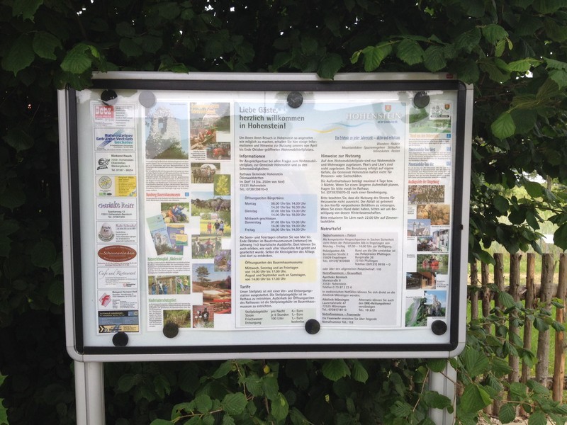 Stellplatz mit 4 (gekuschelt bis sechs) Plätzen absolut ruhige Ortsrandlage Elektrizität (1€ pro 6 Stunden) Übernachtung 4€ ![]() Im Hintergrund links ist die ortsansässige Brauerei mit hochwertiger Küche zu erkennen. Der SP liegt unmittelbar neben einem Bauernhausmuseum. Wir waren Ende Juni dort, deshalb kann ich noch einige Infos und Bilder beisteuern. - der Weg an den Stellplätzen entlang ist sehr wenig befahren - die Stellplatzgebühr ist entweder im Rathaus oder im Bauernhausmuseum zu entrichten - hinter den Stellplätzen besteht ein Grillplatz (Holzkohle oder Holz selbst mitbringen) ![]() Grauwasserentsorgung nicht über Bodeneinlass möglich! ![]() ![]() Frauke, ich danke Dir für die Ergänzung. Die Geschichte mit der Grauwasserentsorgung hatte ich vergessen. Noch etwas zur Entrichtung der Gebühr: Am Wochenende ist das Rathaus geschlossen und das Bauernhausmuseum erst um 14 Uhr geöffnet. Wer also ehrlich sein will, kann ja eine Notiz mit Dankeswort und den 4€ in einen der Briefkästen einwerfen. Ich denke, das käme gut an. Und noch zwei Tipps für die unmittelbare Umgebung: --> Link --> Link |