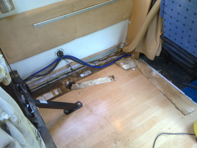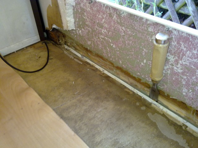 Gedacht und ans Werk gemacht. Sperrholz und Styropor herunter genommen. War alles zwar feucht, aber weiter kein Akt. Dann entdeckte ich den Balken, der die Seitenwand mit der Bodenplatte verbindet. Auch feucht und torfig. Irgendwann wird er schon wieder trockene Stellen haben, dachte ich in meinem jugendlichen Leichtsinn und machte mich dran mehr von dem Balken, Richtung Fahrerhaus offen zu legen. Bis vorne war der gesamte Balken schwarz, modrig und feucht! :cry: Das konnte alles nicht von der Klappe kommen. Und auch nicht vom Wasserschaden im Dach, den ich schon vor einer Weile repariert hatte, da das Styropor über dem Balken trocken war. :!: