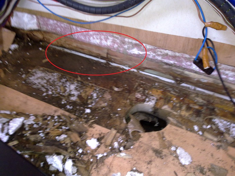Aber kann hier wirklich Wasser eindringen, es fließt doch eigentlich nicht nach oben! Nun kurze Rede, langer Sinn, heute Abend regnete es mal wieder und schon trat an einigen Stellen, hauptsächlich bei der Dinette zwischen Wand und Bodenplatte Wasser zu Tage. :evil: Kann es sein, dass es sich durch Kapillarwirkung durch den Spalt zwischen Bodenplatte und Wand hochzieht? Eine Beschädigung der Aluhaut ist jedenfalls nicht zu sehen. Auf dem Photo der rote Kreis zeigt die Stelle. Das große Loch ist übrigens der Auslass des Wassertanks ;-). Und photofein habe ich auch nicht aufgeräumt :oops: