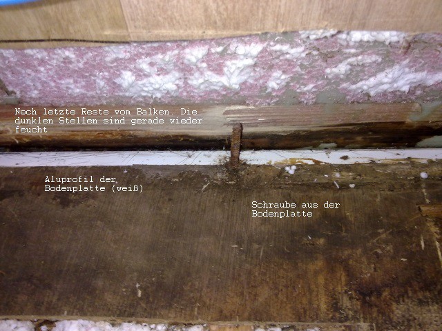 Weiter oben schrieb ich ja schon, dass bei dem damaligen einsetzenden Regen sich bereits erste Wassertropfen zwischen Außenwand und Bodenplatte hochzogen. Normalerweise hätten sie sich sofort im Balken "verspurlost", aber da nun kein Balken mehr da war ...